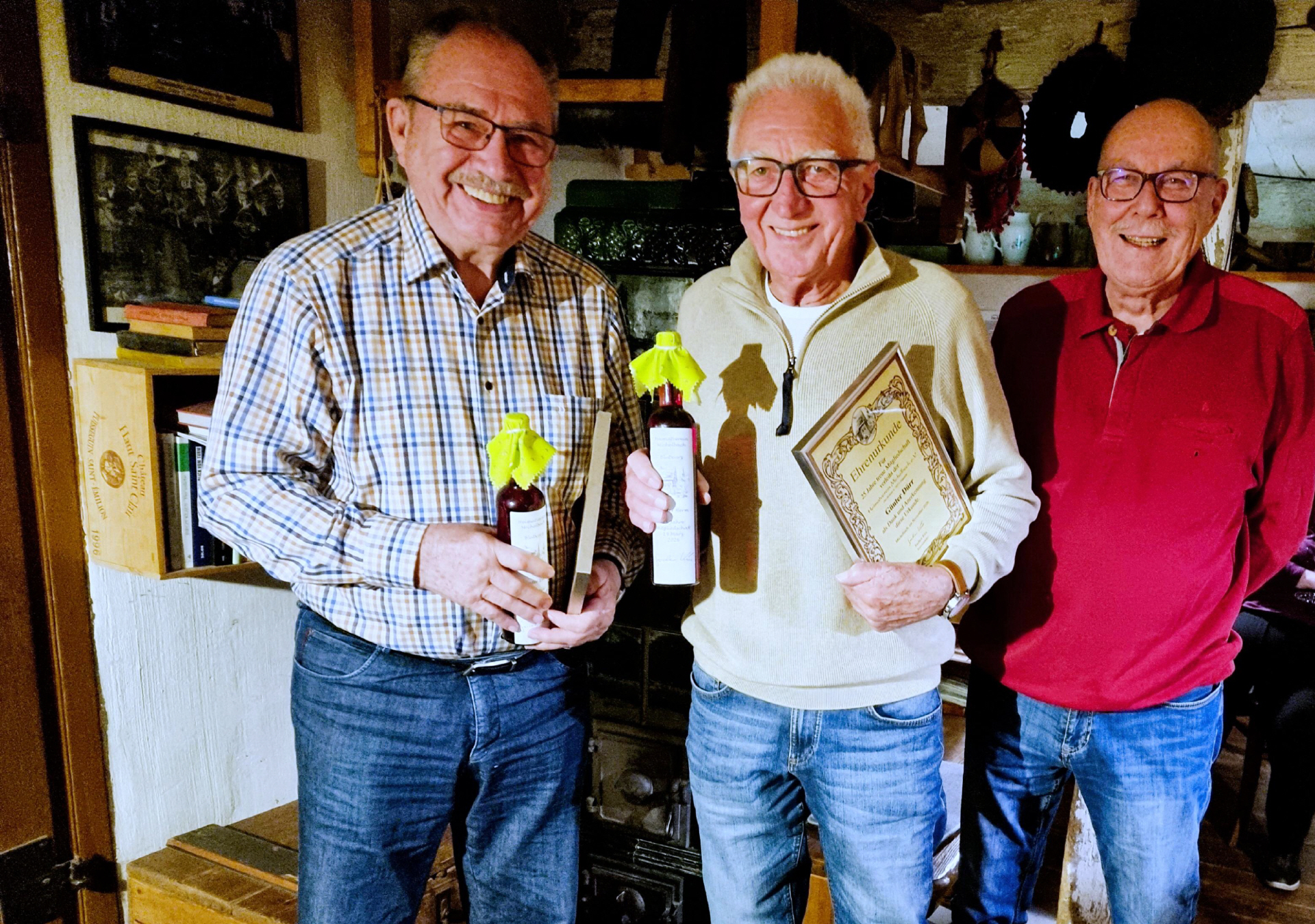 Ein besonderer Höhepunkt des Abends war die Ehrung langjähriger Mitglieder: Gleich sieben Mitglieder können in diesem Jahr auf 25 Jahre Vereinszugehörigkeit zurückblicken. Stellvertretend für alle Jubilare wurden die anwesenden Mitglieder Günter Herm und Günter Dürr geehrt. Neben einer Ehrenurkunde erhielten sie als kleines Dankeschön jeweils eine Flasche Blutwurz.
